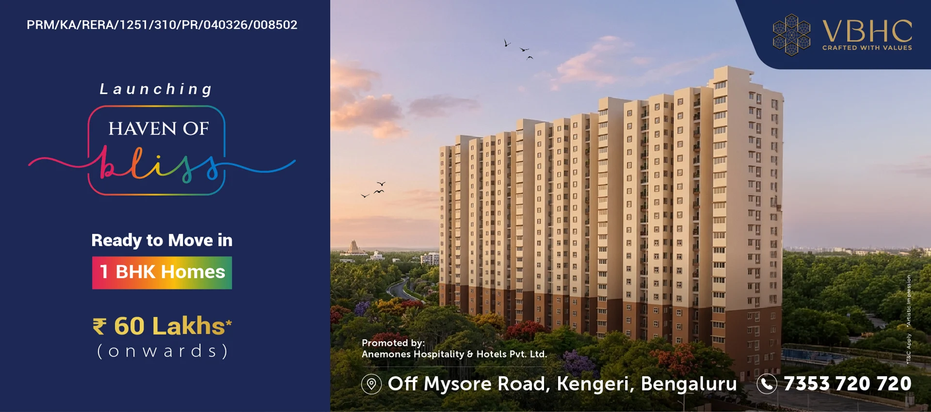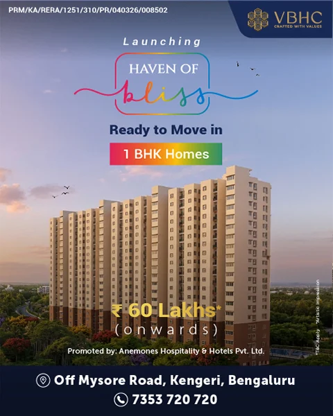 VBHC Haven of Bliss is a residential project located in Kengeri, Off Mysore Road, South Bangalore. Developed by VBHC Value Homes Private Limited, the project is an 18-acre enclave featuring 19-storey towers. It is a RERA-registered society (PRM/KA/RERA/1251/310/PR/040326/008502) offering ready-to-move-in apartments.